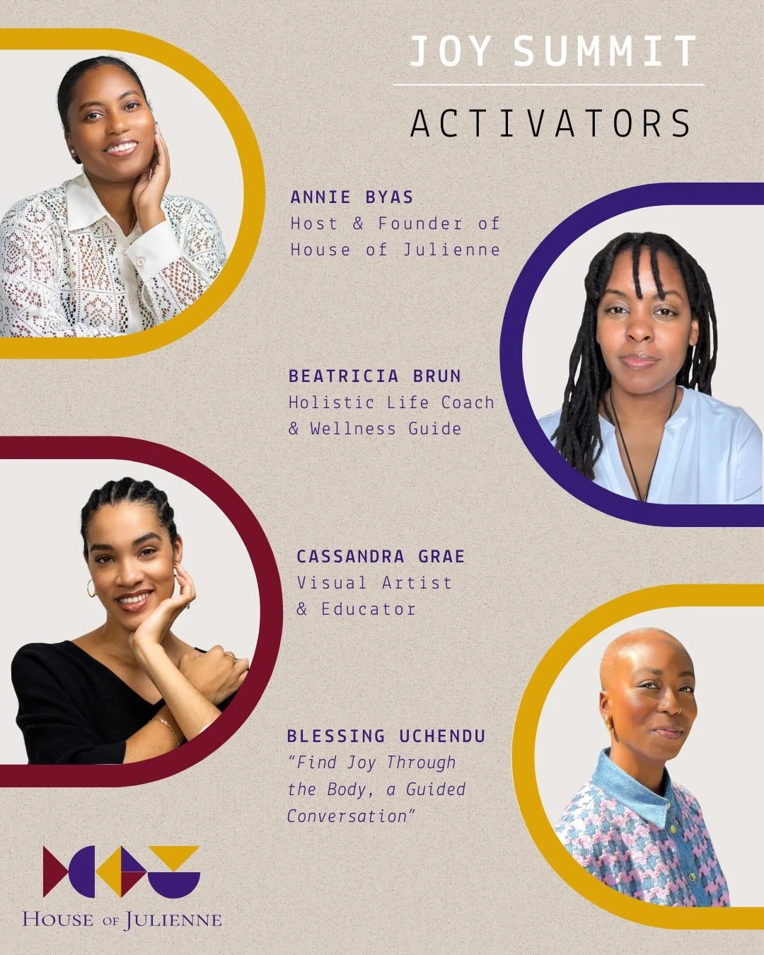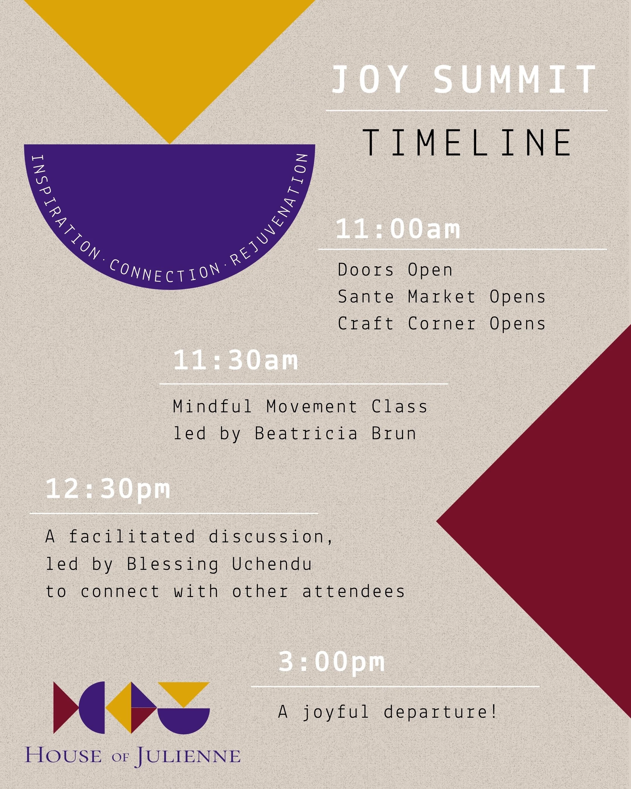 Join us at Joy Summit 2025 hosted by House of Julienne. Centered around replenishing depleted energy, Joy Summit is an event curated for individuals to experience and implement self care through joy. Through organic interactions, attendees will be reminded of things that bring a smile to their faces, leaving them more fulfilled with improved relation to self and others.